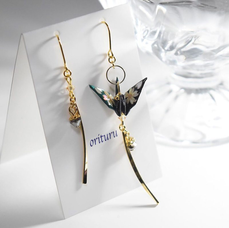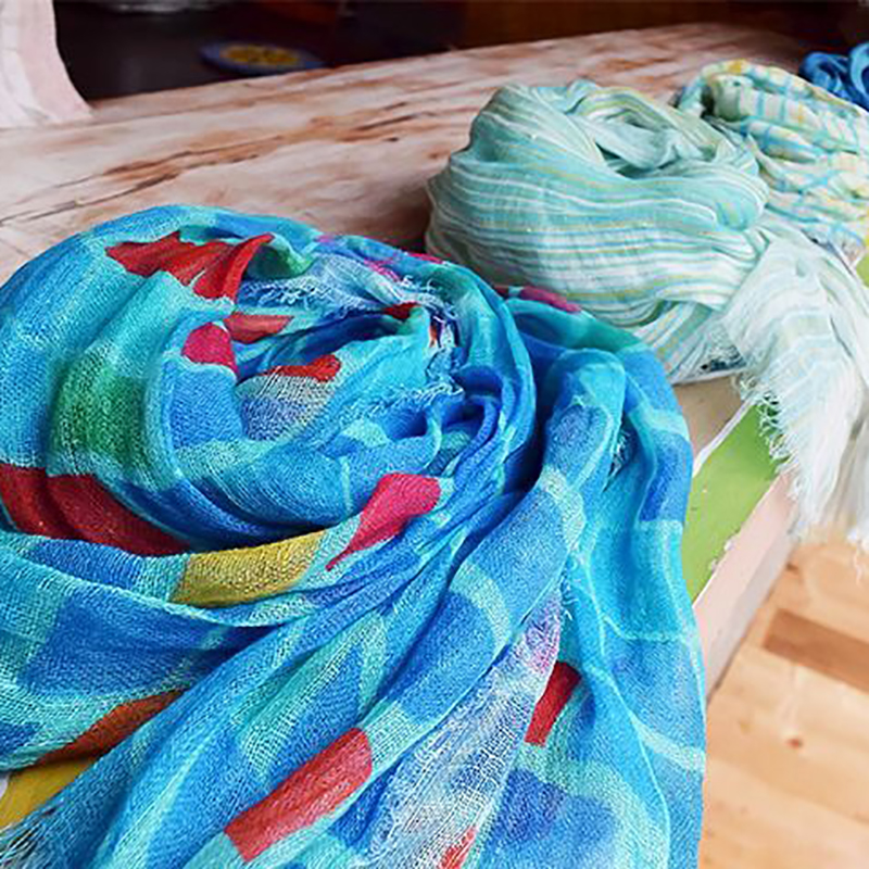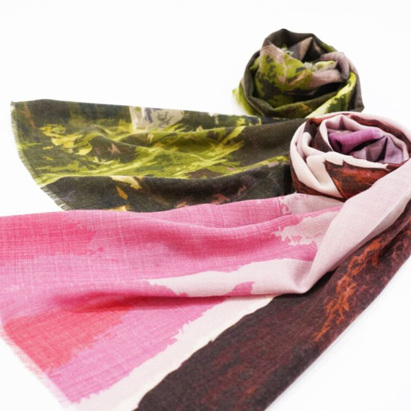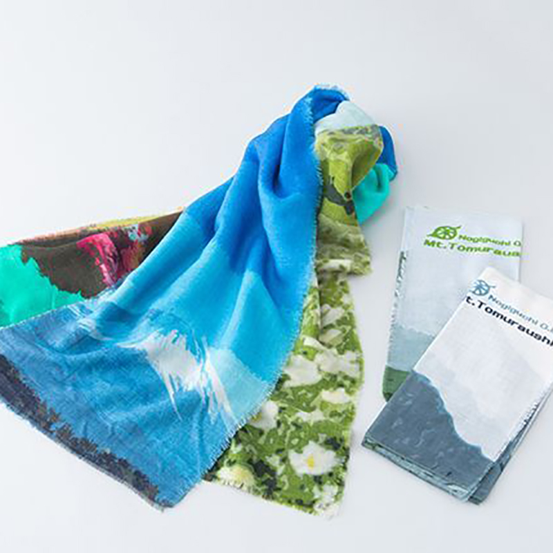 自身の山岳ガイド業の経験から得た実用性と、京友禅呉服製造業から得たデザイン性の両方を持つ京友禅染めの技法で染めたウールマフラーです。「静岡産ウール」に加え、「山梨産ウール」や「愛知産オーガニックウール」の素材に染めています。一概にウールと言いましても色々なものがありますが上質の天然素材にこだわりそれぞれの染め方を駆使しながら創作しております。デザイン面では、日本の伝統文様、山岳風景、京都の風景や自然のモチーフをデザインし、首に巻くとどのようなカラーが出るのかを研究し取り組んでおります。同じく手折りした折鶴に螺鈿細工を施したピアスも制作。自然と人間の英知を結集させ丁寧にデザインしています。