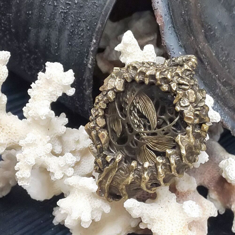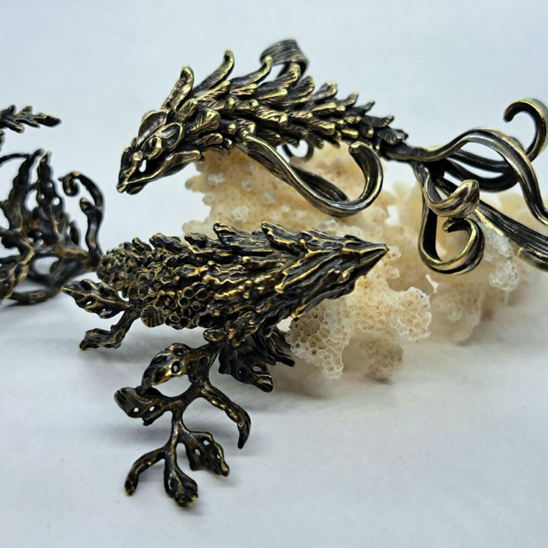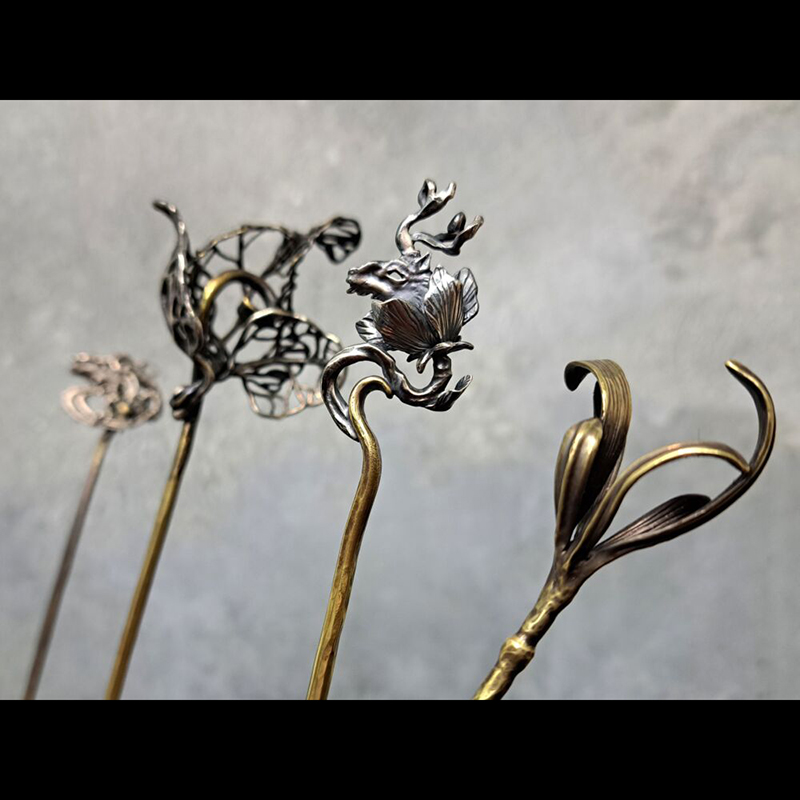 好奇心をくすぐる、オブジェのような玩具のような銀と真鍮のアクセサリー。彫金と鋳金の技術を使ってペンダントやピアスなどの他に、ネクタイピンや簪、ホイッスルなども制作しています。一部が回ったり動いたりする、からくり細工のような細かなギミックや、こっそり隠れた小人や物語など、ほんのりシュールな世界観と遊び心を気付かれないように仕込んだデザインが特徴。それぞれのタイトルをヒントに、何が隠れているのか探しながら見ていただけたら嬉しいです。