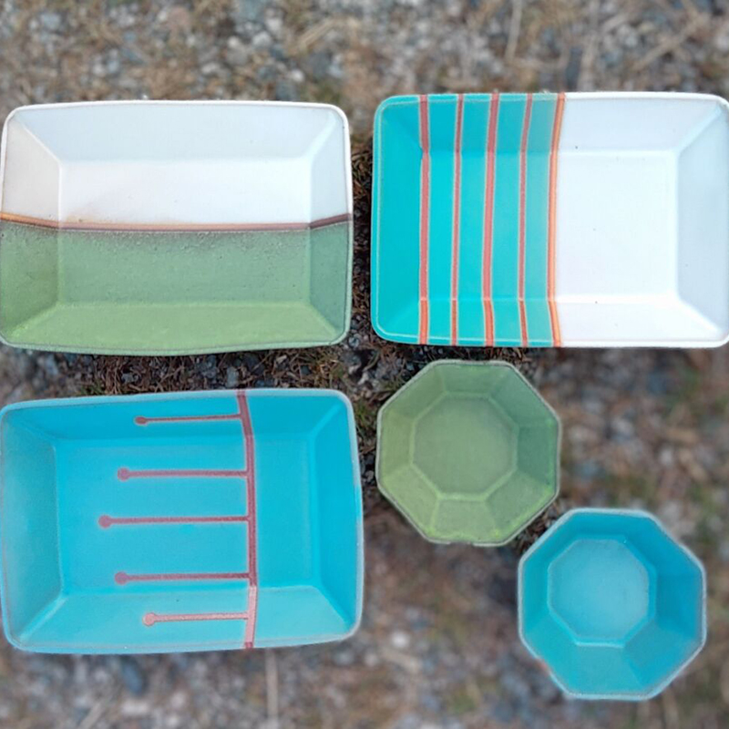 青い釉薬を主に用いて制作した器。全ての行程を1人で行っている手作り作品です。