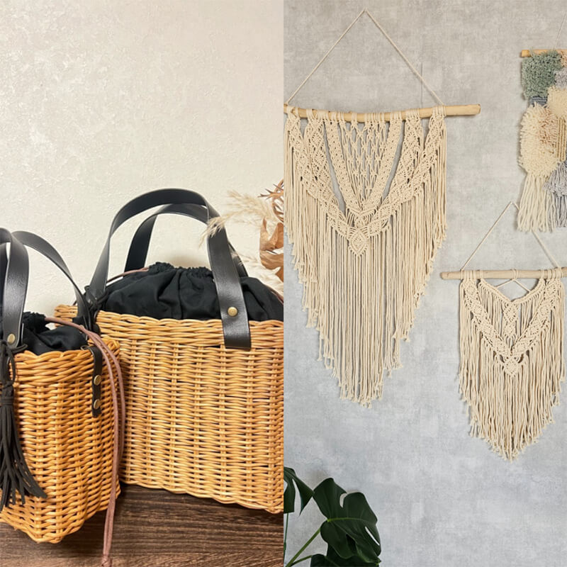 ラタンと布小物、マクラメ雑貨のお店です。ラタンを使用したバッグ、デニムバッグやポーチ、マクラメタペストリーやスマホショルダーまで幅広く取り扱っています。全てオリジナルの商品ばかり!他では見られない、手作りの温かみある作品ばかりです。
