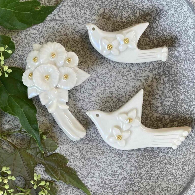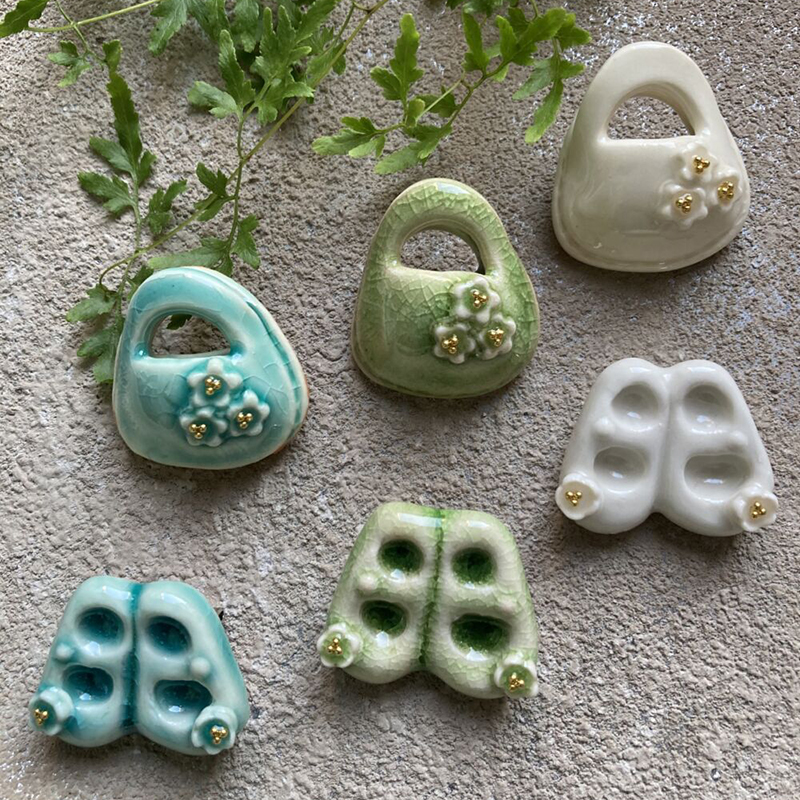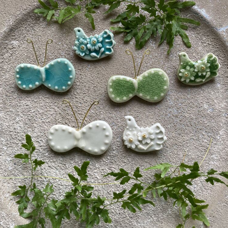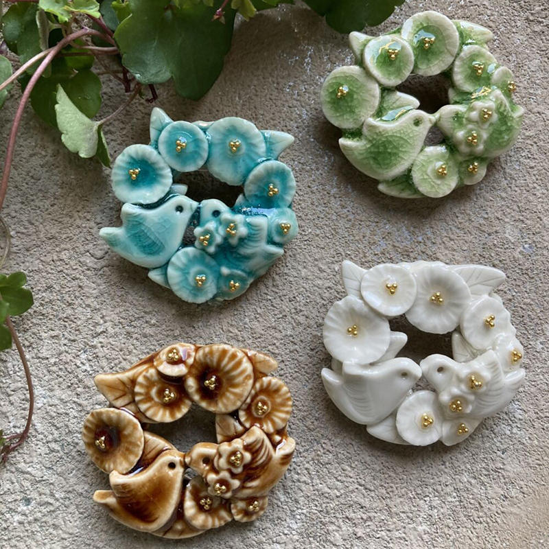 花や動物をモチーフにした沢山の種類のオリジナルの陶ブローチ、お家に飾っていただけるオーナメント類を作っています。作品を見て皆さんが喜んでいるお顔を想像しながら作品作りに励んでいます。作ることが大好きで楽しみながら作っているので、これからも作品が増えそうです。お気に入りの一つを見つけに来ていただけたら嬉しいです。どうぞよろしくお願いいたします。