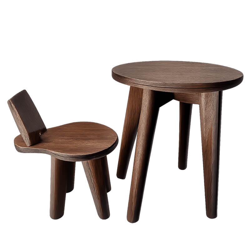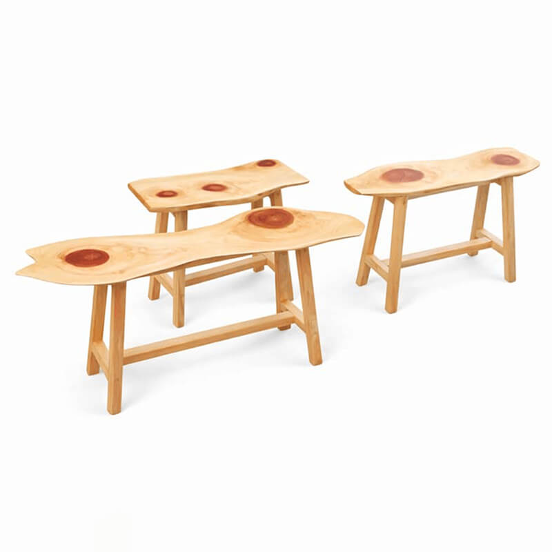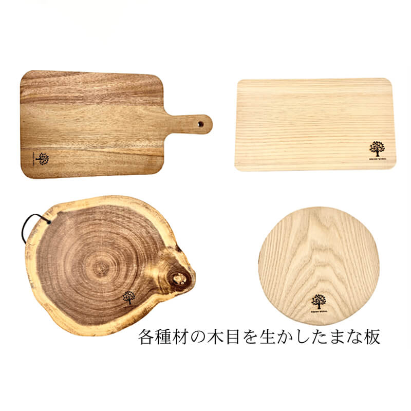 木の持つ自然形態のイスと各種のカッティングボードなど同じ形がふたつとない作品です。