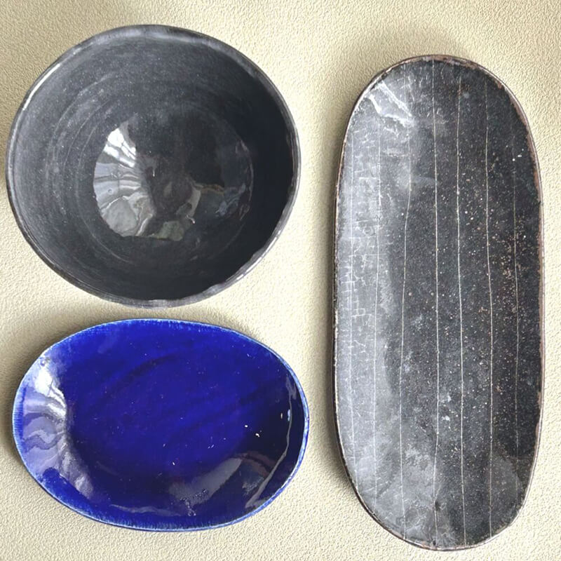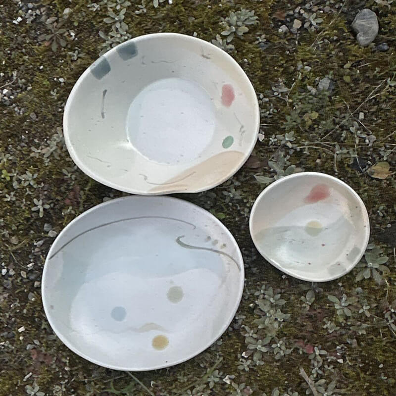モリユミは磁器の器や粉引きの花器、佐々木は織部や志野 るりの食器