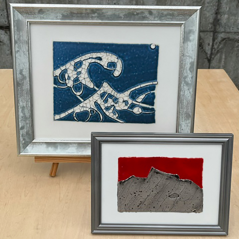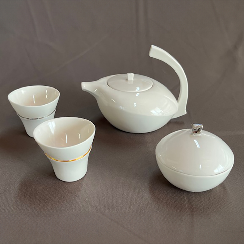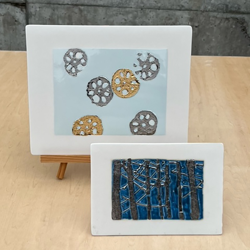 白磁の食器、陶板画を造っています。銀彩が特徴です。