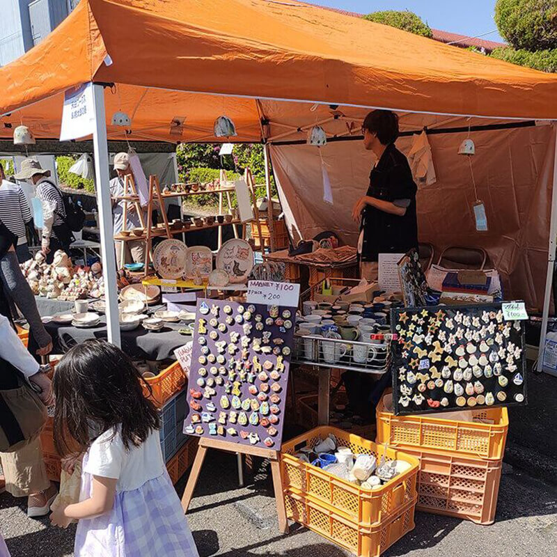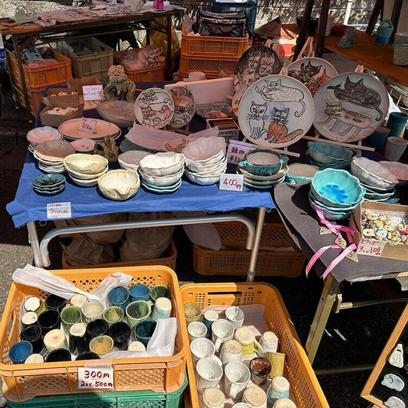 アールブリュットからの贈り物。(施設で生まれた陶器)食器を中心に、マグネット他、いろいろ並びます。